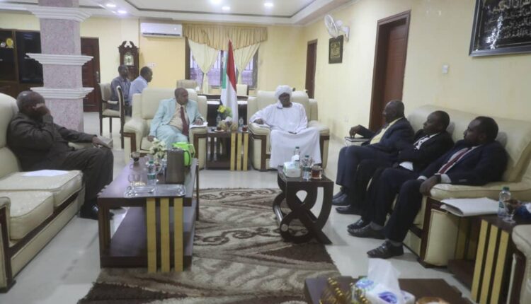 التقي والي ولاية القضارف بمكتبه بمسجل عام تنظيمات مهن الإنتاج الزراعي والحيواني المستشار العام ابوبكر عثمان ورئيس الإدارة القانونية بولاية القضارف ونائب المسجل العام