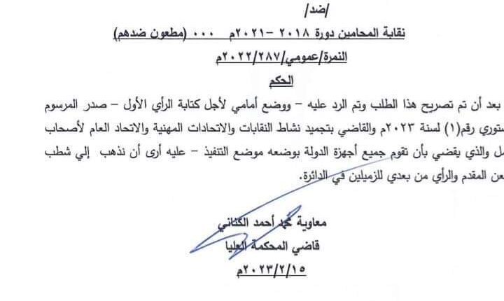 من لجنة تسيير نقابة المحامين ضد نقابة المحامين دورة ٢٠١٨_٢٠٢١م. وقد تحصلت( الايام نيوز) علي صورة من قرار الشطب