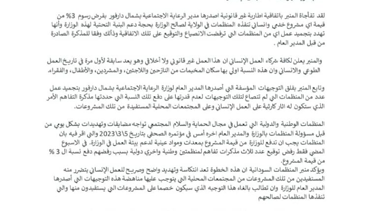 اصدر منبر المنظمات السودانية بيان حول إيقاف بعض المنظمات بشمال دارفور وفرض رسوم علسها وتحصلت (الايام نيوز) علي نسخة من البيان
